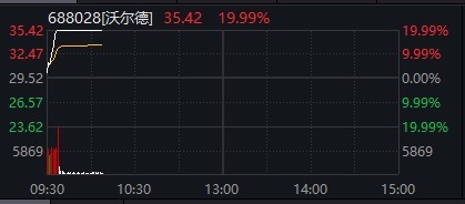 沃尔德早盘强势涨停,截至10时04分,股价报35.42元,较前一交易日收盘价大涨19.99%,成交额达2.23亿元。开盘价30.40元,盘中最高触及35.42元,振幅17.01%,显示出强劲的上攻动能。